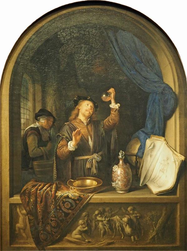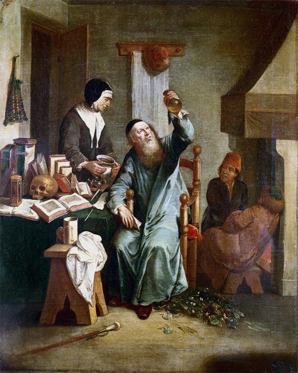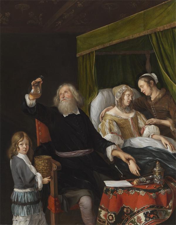 17世纪是尼德兰(包括现今荷兰、比利时、卢森堡,以及法国北部部分地区)的黄金时代,绘画与医学都达到历史上从未有过的高度。尼德兰画派的大师们特别钟爱医生与患者这一题材,而在许多作品中,盛着琥珀色尿液的玻璃烧瓶几乎成了医生的“标配”。