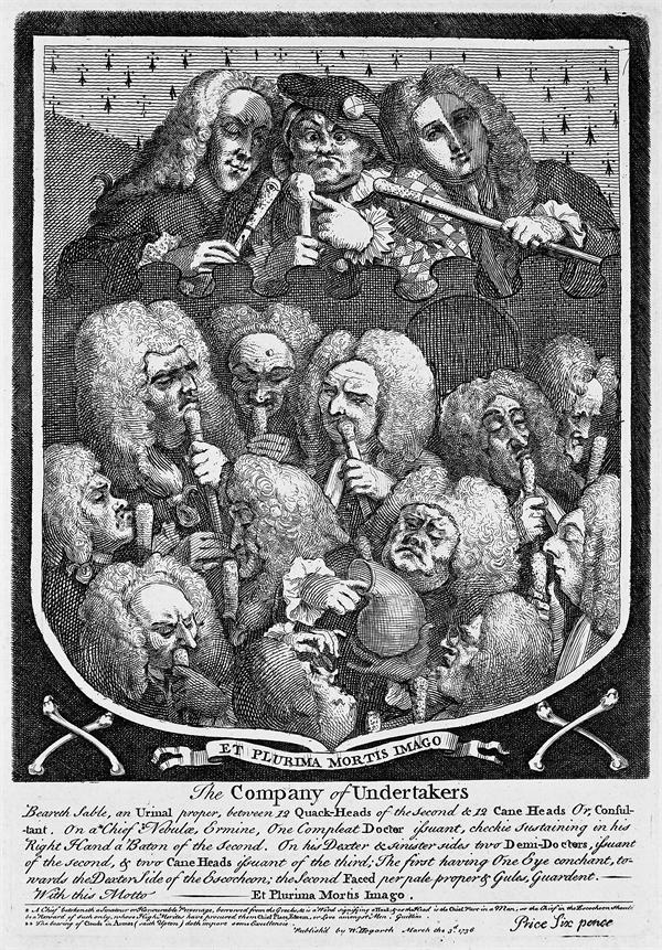 随着近代医学的兴起,希波克拉底和盖伦早已成为明日黄花,通过看、闻、尝等手段来检验尿液的做法也绝迹人间。19世纪以后,艺术家对医生验尿的场景不再感兴趣;偶有表现,也多半带着戏谑嘲讽的意味,风靡了数千年的尿罐子成了庸医的象征。图8是18世纪英国画家威廉·霍加斯的讽刺版画,画中描绘了各式各样的庸医,其中最上面的三位是无照医生,中间那位是有名有姓的接骨郎中萨利·马普(Sally Mapp),下面12个人都是伦敦皇家医学院的执照医生,一律戴着假发拿着手杖,手杖的把手里塞满了樟脑或薄荷——每个人都不无炫耀地嗅着。画面下方偏右有一位先生的手指还浸在尿瓶里,看起来是要沾上点尿液来品尝。标题“殡葬公司”显然是嘲讽这些庸医杀人不偿命。