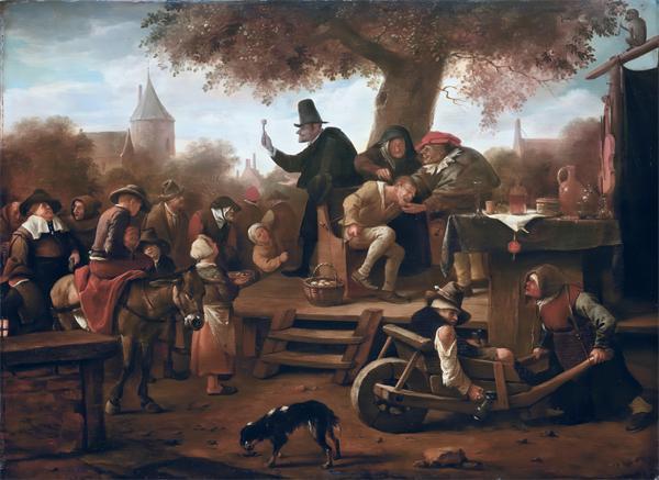 前面述及画中的荷兰医生,无论是在乡间还是市镇,都给人一种一丝不苟的印象,一本正经地治病救人,有的人或许还是当时的名医。可以想象,画家们也是以崇敬的心情描绘这些形象的,看不出丝毫的嘲讽或戏谑成分。不过,尼德兰画家还有一些描绘江湖郎中的作品,如图7,出自著名的风俗画家扬·斯特恩(Jan Steen,约1626-1679),画中的医生如同马戏团的小丑一样,看上去正在给患者拔牙,身后的桌子上也有尿瓶子。