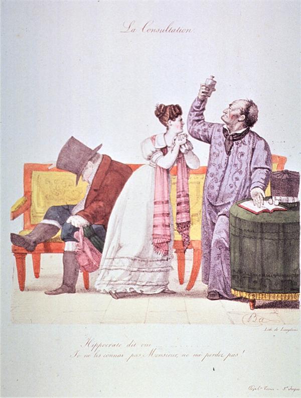 图10是一位叫郎古姆(Langlumé)的画家所绘:一位妇人双手在胸前绞着手绢,关切地询问丈夫的病情;戴着大礼帽、身着外套、脚蹬长筒靴的丈夫坐在沙发里昏昏欲睡;医生穿得花里胡哨,一手举着尿瓶,一手指向摊开在桌上的医书。图下的法文是两个人的对话——医生:希波克拉底说有救。妇人:我不认识他,先生,但是别毁了我!