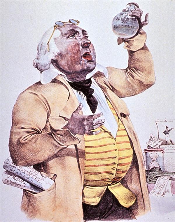 下面是两幅法国人的讽刺画。图9出自瓦提尔(Charles Wattier,1800-1868),画的是一位大腹便便的卡通型人物,正在端详烧瓶里的尿液;架在前额上的眼镜表明他是个老花眼,或者暗示他的目力不可靠,或者嘲讽他是个不合时宜的老古董。题名“验尿医生”下面还有两行法文小字:“哦,上帝,多么热,多么烧!这个患者身体都发黄了,只是他的糟糕体质不能承受西南风。”