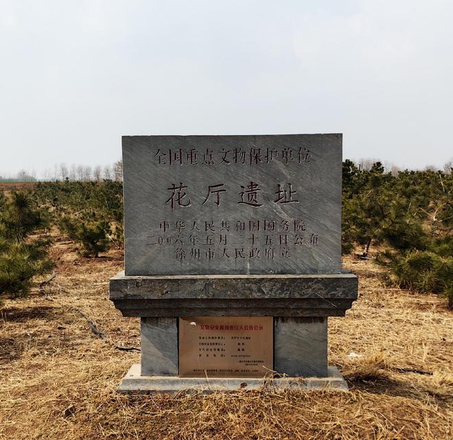 花厅遗址位于江苏徐州新沂市西南约20公里的马陵山丘陵地带南端高地上,海拔约69米。我到达时的花厅遗址,是一大片看似普通的农田,因为是初春,还没有耕作,所以显得一片枯黄,只有“全国重点文物保护单位”的文保标志碑,提示着这片区域的非凡身份。