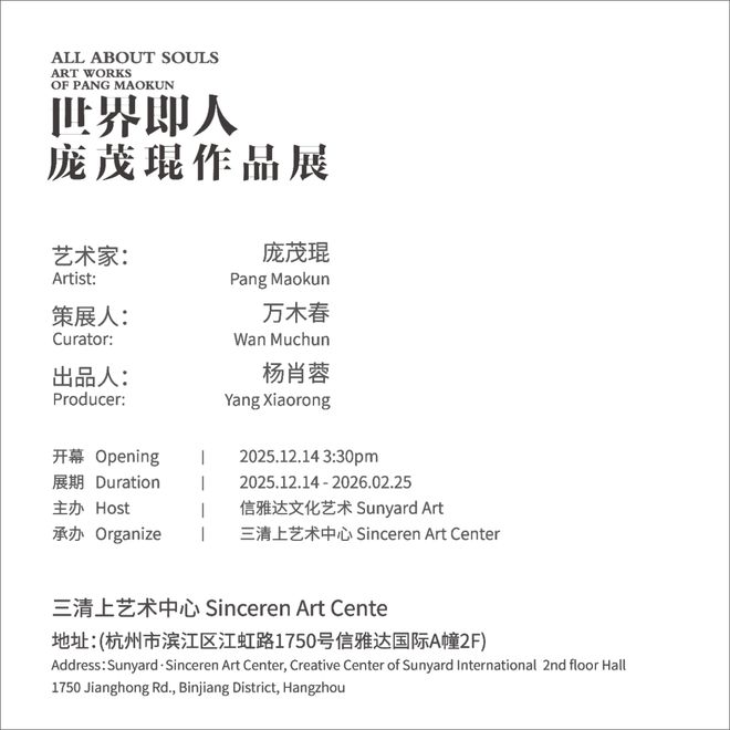 2025年12月14日,杭州三清上艺术中心将隆重推出「世界即人」庞茂琨作品展。
