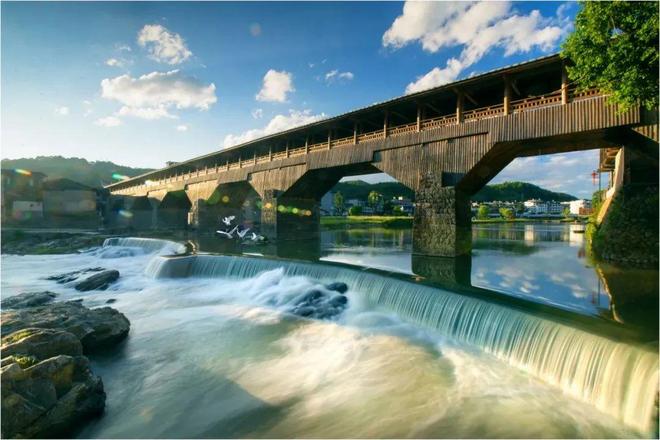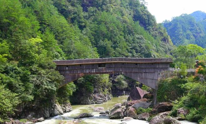 木拱廊桥制作工艺特色鲜明,以榫卯结构为绑扎方式,内桥面弧度增大,起拱高、受力好,加盖了桥屋,桥外形如虾蛄,桥脊重檐、歇山或飞檐翘角,桥内中间顶上藻井重叠斗拱,因而给人美的视觉享受。一座木拱桥廊桥不仅有着交通的作用,还是附近一方百姓的社交场所。