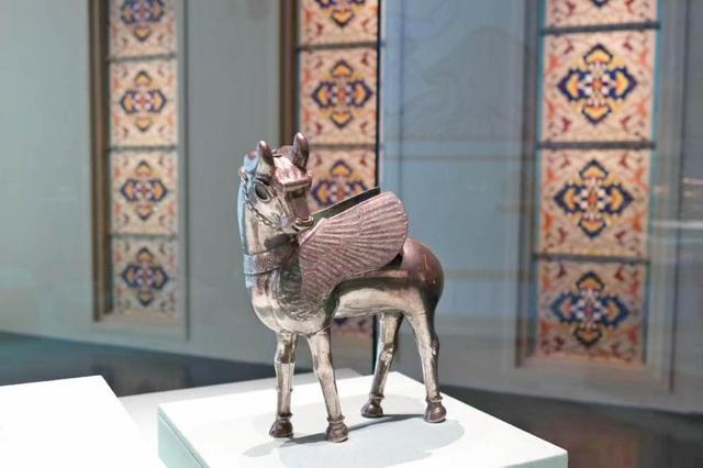 记者在现场看到,猛禽形来通杯气势凌厉,牛首来通杯沉稳雄健,双狮来通杯则充满着力量的象征,每件形态各异的来通杯都有着流畅的形体与细腻的纹路,可见古代匠人对动物形态的敏锐观察与高超表现力。这些来通杯不仅自身极具艺术价值,更是文明交流的生动载体。策展人马露霞介绍,它们的使用曾广布于古代西亚、中亚乃至波斯,后经由丝绸之路东传至中国,更成为东西方技艺与观念互鉴的璀璨实证。