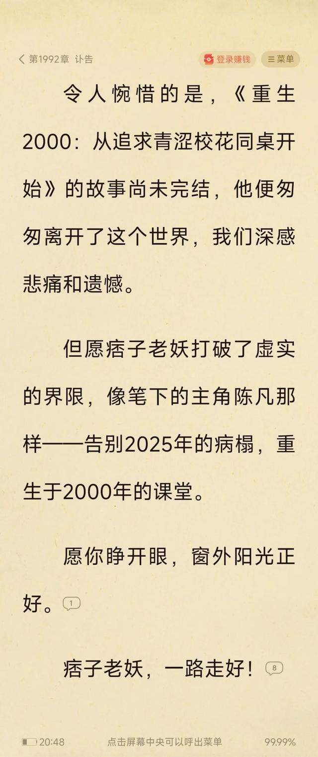 近日,多位网文博主发文称,七猫中文网签约作家“痞子老妖”于2025年11月16日因突发心梗离世。记者查询到,其最后一部小说《重生2000》第1991章末尾,自称“痞子老妖”爱人发布了一份讣告,称作者“痞子老妖”11月16日因为心梗突然离世,她帮“痞子老妖”为小说补充上了结尾。12月10日,七猫中文网在1992章再次发布讣告,送别“痞子老妖”。