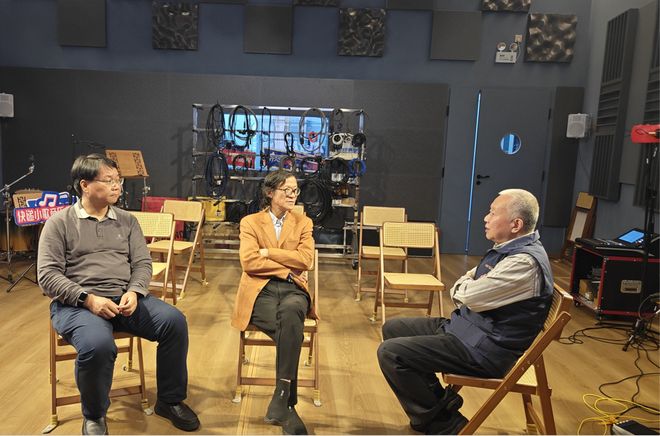 胡野秋(中)与 “盲盒录音棚”创始人黄文宣(左)及赵平(右)座谈中