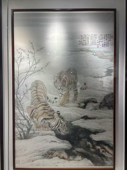 展览现场,最引人瞩目的无疑是多幅画虎的作品,或侧卧、或回首、或漫步,姿态各异,栩栩如生。美术评论家、《美术研究》主编邵大箴曾表示:“大中在仿前人的作品中不求笔笔与原本相同,而在自己的创作中更是在前人经验的基础上,在师古人‘心’的前提下,追求表现自己的独立精神。中国艺术史上画虎者不乏其人,而大中敢于独立门户,自成一家,赋予虎的形象以新的精神内涵和新的文化意味。”
