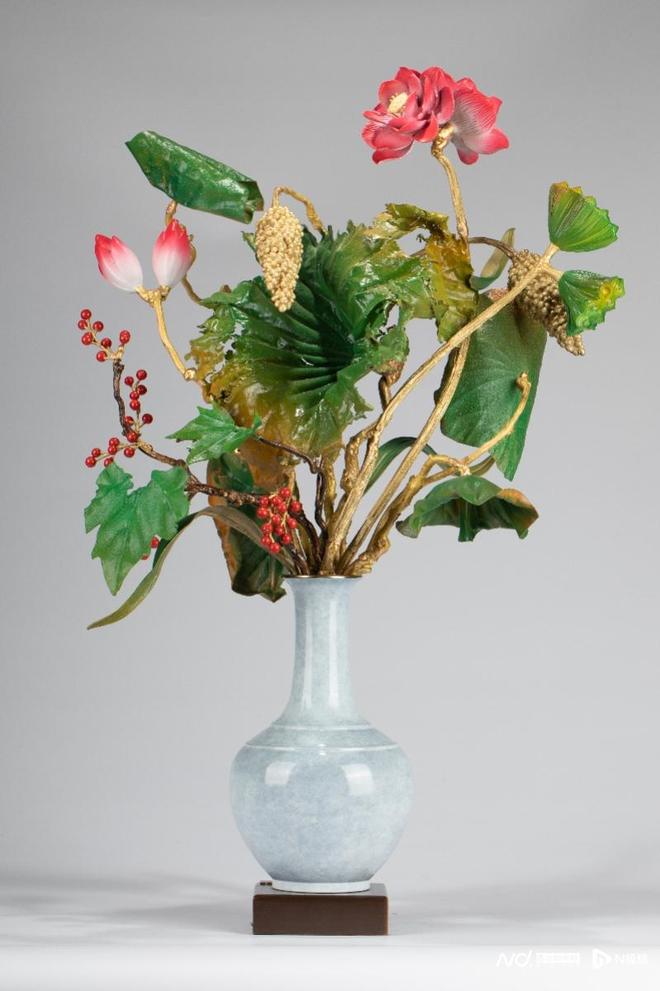 此次中国国家博物馆收藏了朱炳仁9组(共10件)艺术作品和朱军岷4件艺术作品。朱炳仁的《千浪卷雪》《万里长城》《千里江山》等作品立意高远,气势磅礴,彰显中华美学的雄浑气魄;《国鹿》《青花铜瓶》源于传统,分别以独特的“动感”塑造和精妙的色彩搭配,凸显创新意义;《燃烧的向日葵》以鲜明的创新特质见长,运用熔铜手法塑造了富有生命力的向日葵形象,不仅体现中华美学意蕴,而且富有现代气息,形成与西方艺术的对话,堪称中国工艺美术当代创新的典型代表。朱军岷的《连年如意》《繁花似锦》《蕉石鹤寿》《万全如意》以中国古代传统吉祥题材展开创作,在材质、造型、颜色处理方面匠心独运,多有突破和创新,古典意蕴与当代意蕴交融,形成古雅而时尚的审美风格。
