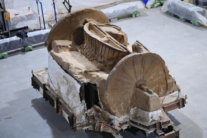 12月12日在陕西省考古研究院文物保护实验室拍摄的瓦窑沟墓地M3号墓出土双辕车。新华社记者 李一博 摄