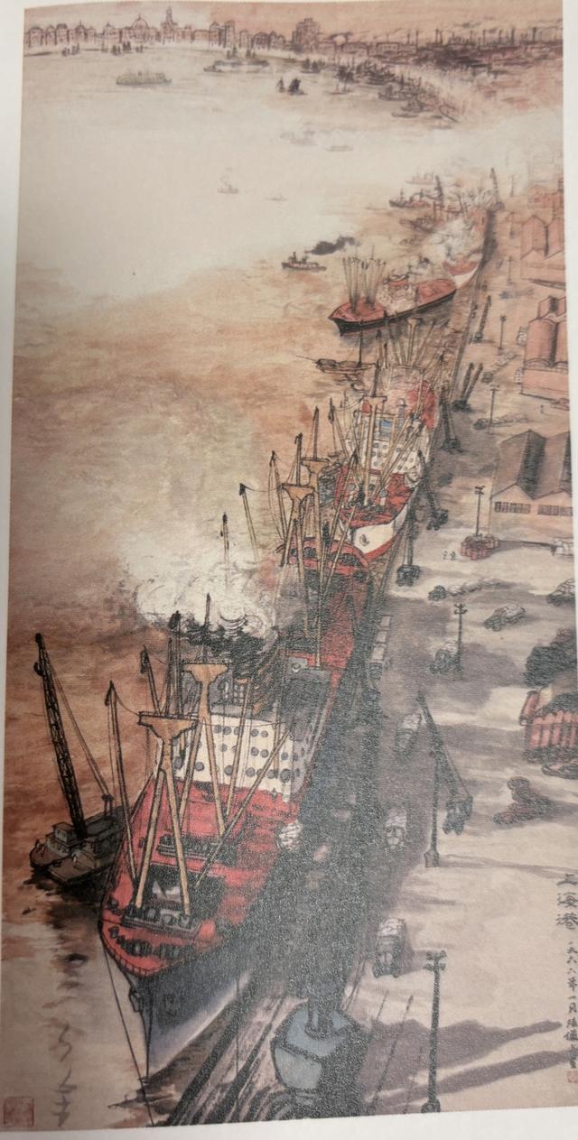 山水画的变革,同样迸发出强烈的时代音律。20世纪五六十年代,为响应社会主义建设的号召,美术界掀起“新国画运动”。国画家们将工业建设,城市风景融入山水画创作,尝试运用传统中国画技法展现城市工业化建设的风貌。这一背景下,陆俨少完成了《上海港》。作品通过俯视视角,展现了上海港码头的繁忙景象。画中,大型货轮停泊码头,吊车起起落落,满载货物的卡车络绎穿梭。浦江畔,云水间,鳞次栉比的外滩建筑群若隐若现。画面沿湖面沿岸弧线徐徐铺展,钢铁货轮、城市楼房、马路汽车等现代工业意象,与朦胧烟气、宽阔江面和谐相融、刚柔互映。