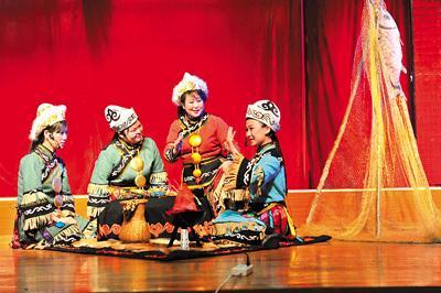 伊玛堪国家级代表性传承人葛玉霞(右二)在说唱《希特莫日根》之“英雄诞生”片段。
