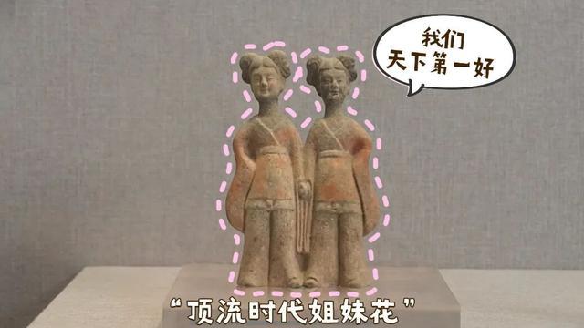 洛阳博物馆的北魏彩绘陶牵手女佣,出土自洛阳市宜阳县马窑村杨机墓,与常见的陶俑不同,这件陶俑由两人组成,姐俩头梳双髻,饰有花钿,身着左衽宽袖红色上衣,下着宽大喇叭形长裤,束腰带,并肩站立,手牵着手,笑容温婉、姿态亲昵,被网友称为“千年好闺蜜”。