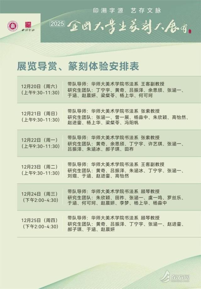 展览持续至12月25日,期间每日设篆刻主题工作坊,由华东师范大学书法篆刻专业师生团队现场指导,让观众亲自动手,沉浸式体验篆刻艺术魅力。