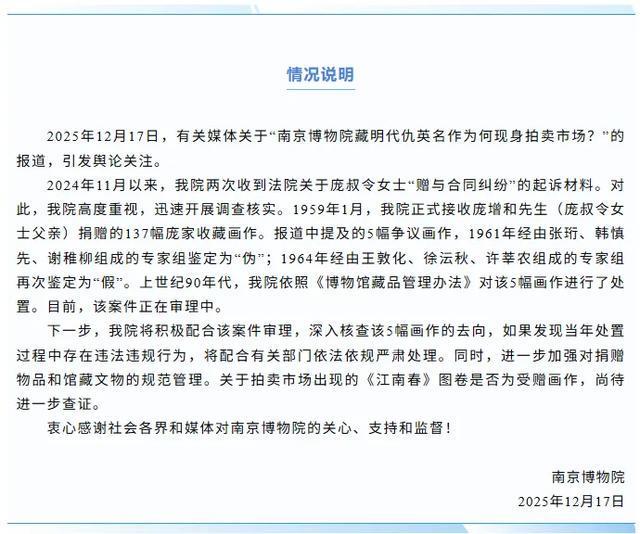 近日,媒体报道南京博物院馆藏名画现身拍卖市场,引发关注。