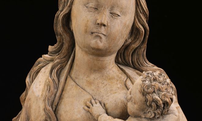 这场特展的核心是一尊新入藏的16世纪早期“哺乳圣母”胸像。这件雕塑属于中世纪晚期上施瓦本地区(Oberschwaben)最杰出的作品之一,最初是柏林银行家伯努瓦·奥本海姆的重要收藏,如今其藏品大多陈列于博德博物馆。