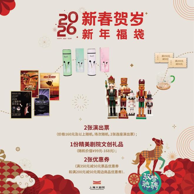 广受欢迎的新春贺岁新年福袋将于2025年12月25日起在上海大剧院微信小程序限量发售。今年的福袋内含随机2张连座演出票品、精美剧院文创礼品及优惠券等惊喜福利,值得一提的是,观众从福袋中开出的演出票场次将不仅限于上海大剧院,更有机会得到YOUNG剧场或苏州狮山大剧院的热门演出票,真正实现“大西YOUNG聚场”的新年福气共享,以上海大剧院为轴心,将新春祝福辐射至更广泛的文化生活圈。