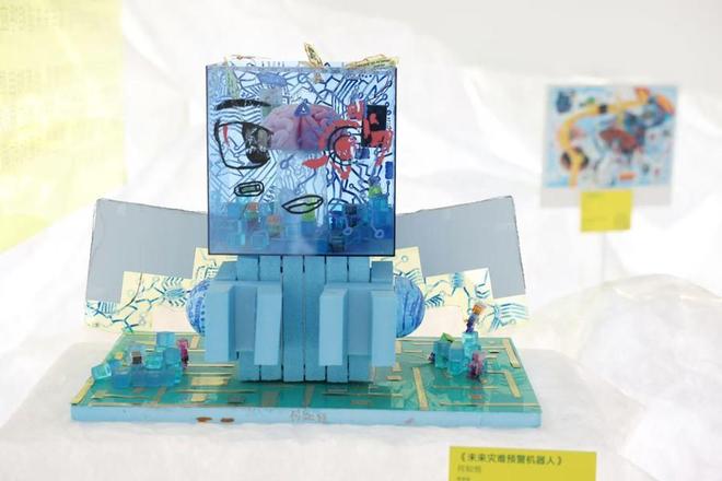 步入展厅,白色半透明的纸质材料经过裁剪后,堆叠悬挂成一座座“雪山”,背透光效设计使得展厅仿佛一处梦幻空间,展品错落有致点缀其中。记者在现场看到,小小艺术家们的画作带有鲜明的新时代特色,宇宙太空、高新科技,是展品中十分常见的题材。比如,获得本届“天书奖”的作品《漫游未来》,就是二年级学生乔世恒用画笔构建的一个太空童话。在他的画中,巨型飞船载着动物朋友遨游星河,地球如同一颗蓝色明珠镶嵌在画面一角。“创意构思奖”得主是13岁的罗辰汐,她自编自演的多媒体视频作品《飞翔马戏团—时间缝隙入画冒险》,呈现了一场关于勇气的冒险。片中,她与猫咪伙伴穿越时空缝隙,用音乐战胜魔法。“愿美好的梦想、飞翔的灵感、吉他、画笔和小猫咪永远与我相伴。”罗辰汐说。