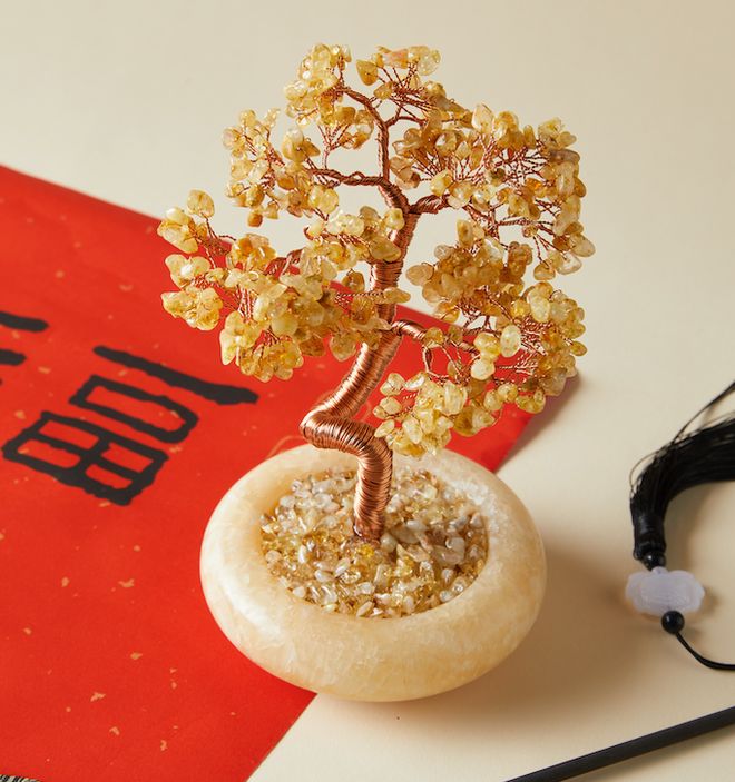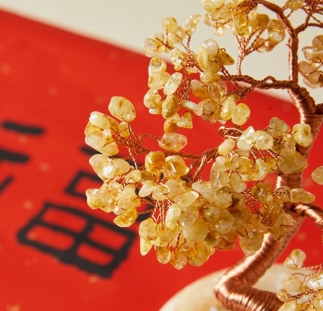 发财树,选择天然黄水晶,手工精抿细捏成树形,寓意马年财源滚滚来。