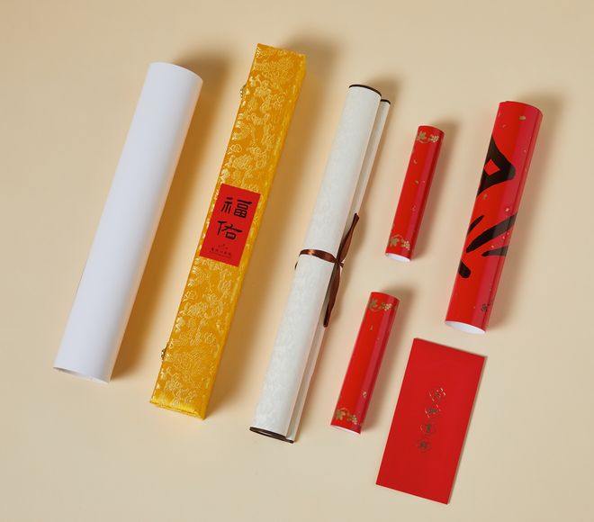 包含:“福佑”卷轴挂历1幅、对联1副(对联17×100cm、横批15×45cm、福字29×29cm)、六时吉祥红包6只(8×9cm)