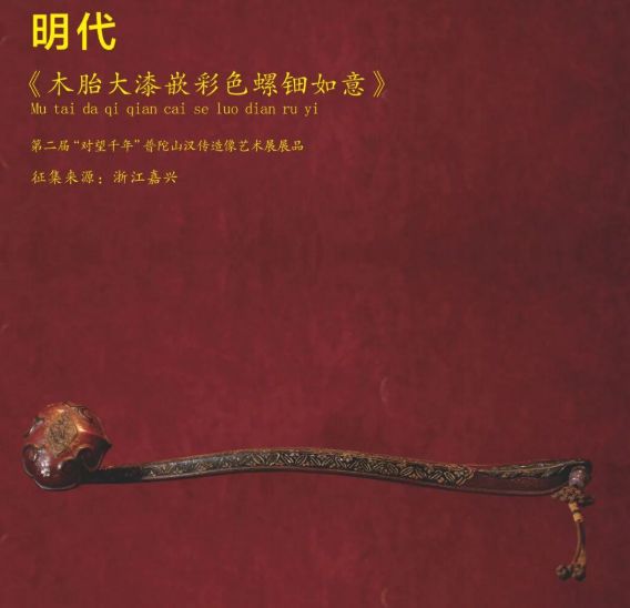 这幅版面的原物是一件文物——明代·木胎大漆嵌彩色螺钿如意,是2021年第二届普陀山汉传观音造像艺术展上的展品。