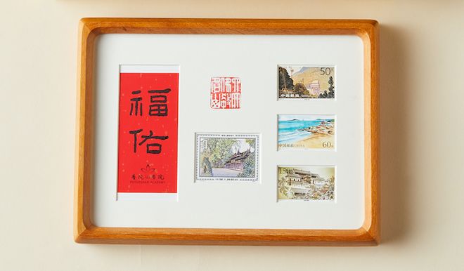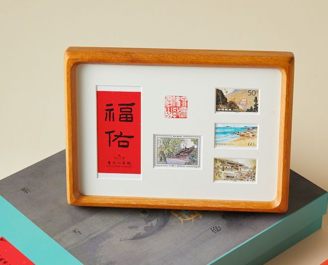 摆台镜框由黄金檀实木制成,榫卯结构,做工考究,一按即可开合。除去随赠的邮票,日常也可作相框摆设。单这款镜框,某宝就要卖199元。