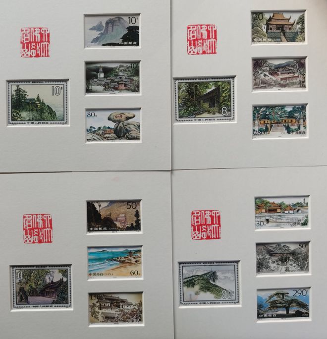 这四套邮票,分别是中国邮政1984年发行的峨眉山邮票、1995年发行的九华山邮票、1997年发行的五台山邮票、1999年发行的普陀山邮票。每套邮票都有四张,随机组合发货。