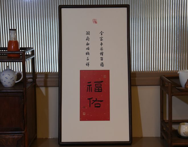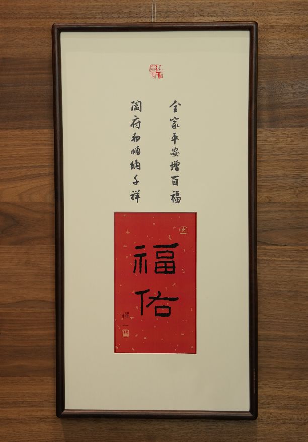 边框采用海棠木装裱,高级天然,与“福佑”、对联气质浑然一体。