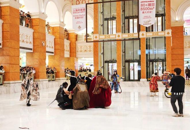 这场实景剧由环球港引入的专业剧团精心打造,剧组为呈现完美效果,已在商场紧张排练半月有余。剧组工作人员王泓介绍,为了增强观剧体验,不少场景都力求融入环球港的建筑造型,如因玻璃栈道形似 “竞技场”,哈姆雷特与罗密欧的击剑戏份便特地在此上演。