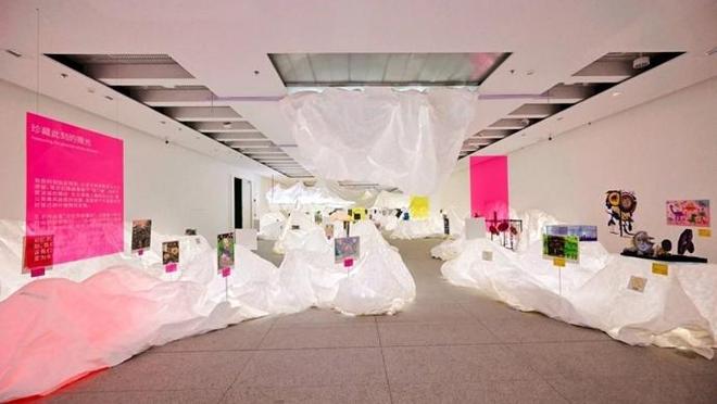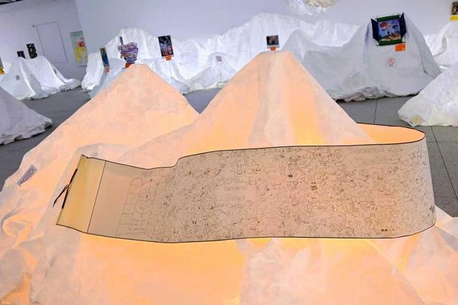浦东美术馆邀请著名工业设计师杨明洁担任本次展览展陈设计师。展览动线由入口“虚山水”装置进入到一个梦幻空间,白色半透的特卫强纸质材料贯穿全场,通过裁剪、褶皱、堆叠、悬挂等方式塑形,带有呼吸感的背透光效设计增加了现场质感与互动趣味,仿佛置身于一个穿越时空后的超现实虚构世界,以此呼应“打开时间之门”的展览主题。