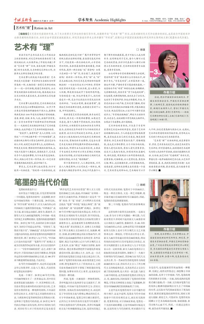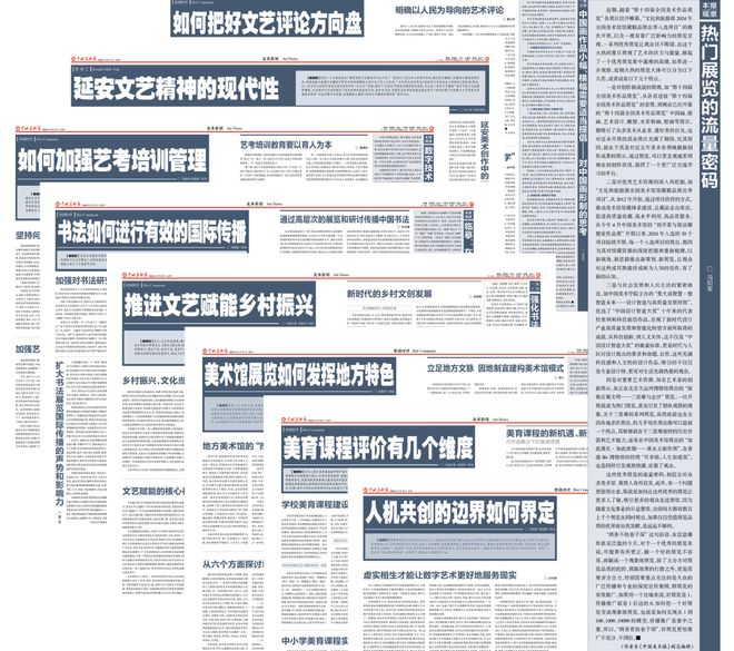 一、把握时代脉搏,彰显责任担当。美育关乎国民素养与创新活力,《中国美术报》连续推出“蔡元培美育理念的当代意义”“审美素养如何评价”“美育学学科建立的前景与困难”等专题,这些讨论为政策制定与教学实践提供了理论支撑,推动美育从“边缘补充”走向“核心素养”。面对AIGC(生成式人工智能)席卷艺术领域,《中国美术报》及时组织“人机共创的边界如何界定”“深度智能时代艺术家会向何处去”等讨论,此类评论既警惕技术乌托邦,又拒绝保守排斥,倡导“虚实相生”的理性路径。为响应国家“文化产业赋能乡村振兴”战略,报纸策划了“新时代的‘艺术乡建’向何处去”“非遗如何走进当代生活”等专题。女性艺术或女性艺术家是一个常谈常新的话题,本报自创刊以来便持续关注女性艺术家的成长与发展,策划了“新时代女性艺术家的处境与创作实践”“与时俱进的女性艺术”“如何理解‘女性艺术’”等专题讨论。在文明互鉴背景下,以“书法如何进行有效的国际传播”“美术在国际文化传播中的价值”等选题探索中国艺术“走出去”的有效路径,强调避免符号化展示,而应通过深层对话传递中华美学精神,使美术成为文明交流的柔性纽带。