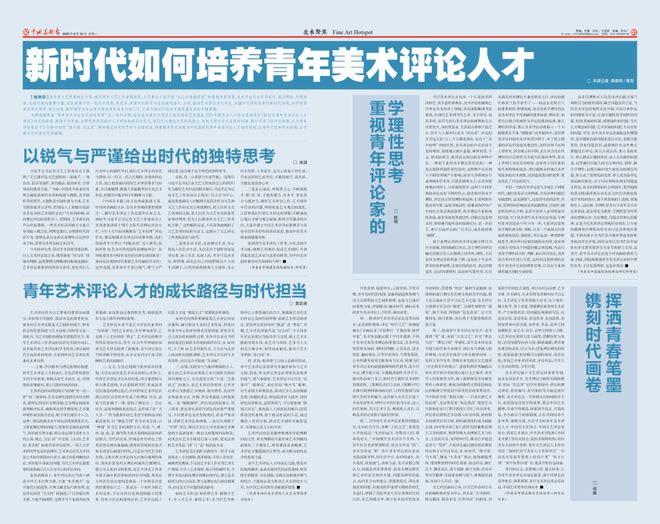 二、构建评论生态,培育青年力量。新发展需要有新的内容和形式,为此,本报还先后开设了新类型的艺术评论栏目“本报观察”与“艺术有‘理’”,这是对新时代文艺评论使命的回应,也是助力中国美术评论体系建构的具体行动。“本报观察”是编辑记者代表本报编辑部发表观点的一个有效窗口,同时,借助这一栏目,也使编辑记者与读者的沟通交流更为畅达和便捷。“艺术有‘理’”邀请专家谈艺论道,形成多元话语空间,针对普通观众,把深奥的艺术道理化为深入浅出的平实话语,说他们能懂的大实话、大白话,带着大家一起开始愉快的艺术之旅,从艺术中寻找到真、善、美,找到生活的更多乐趣。《中国美术报》不仅生产内容,更致力于构建健康的评论生态。