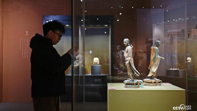 现场展出的鎏金寒山、拾得铜造像吸引市民游客驻足观看。陈玮炜 摄