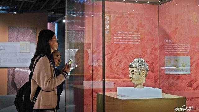 现场展出的彩绘泥塑佛头像,于1990年在宁夏贺兰县宏佛塔出土,佛像眼珠以黑色釉料特制,但下眼睑残留两道黑色泪痕,形成“流泪”的视觉效果。 陈玮炜 摄
