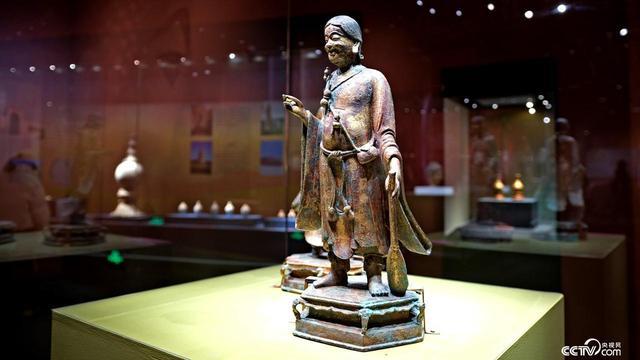 现场展出的鎏金寒山、拾得铜造像均取立姿,足踏双层六边形须弥台。披长发,圆面长耳,满面笑容,形象逼真。生动诠释了“寒山捧卷,拾得执帚”的经典形象,属西夏青铜造像之精品。图为鎏金拾得铜造像。陈玮炜 摄