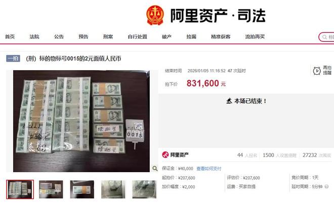 1月5日,记者从阿里资产平台获悉,一批2元面值的人民币完成拍卖。经过44人报名竞拍、历时24小时的出价,最终于1月5日上午11点16分,以83.16万元成交。
