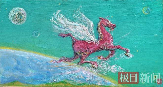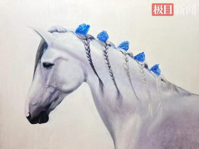 展览现场,多件马主题佳作成为焦点。职业艺术家韩方专门创作的油画《赤马飞天》,以雄浑浪漫的笔触寓意马年大展宏图,美术馆同步推出限量版画及文创产品;江汉大学美术学院教师李俊的《马到成功》,用红底白线的强烈对比勾勒奔腾马态,动感十足,传递出“马到成功”的美好期许;湖北美院雕塑系毕业的艺术家李磊带来油画《LOLA的白马》,紫蓝灰的梦幻色调中,白马与蓝色玫瑰交织出静谧意境,尽显女性柔美与内心丰盈。