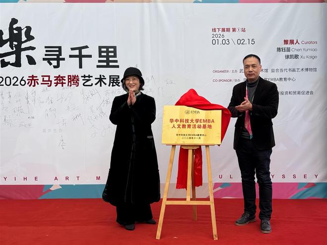 开幕式上,华中科技大学EMBA人文教育活动基地同步揭牌。华中科技大学管理学院副院长戴鑫与益合美术馆首席运营官梁璐共同为基地揭牌,双方将以此次合作为契机,推动艺术与商科教育深度融合。