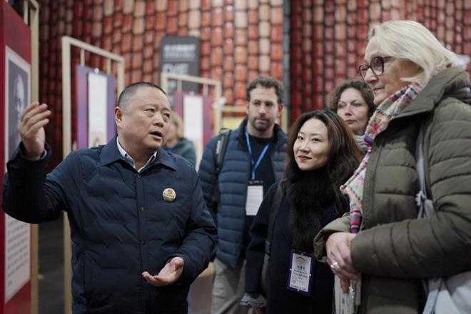 近日,上海东方艺术中心大堂展出20多幅丰子恺相关画作印刷品,丰子恺之孙丰羽(左)向中外参观者介绍作品。