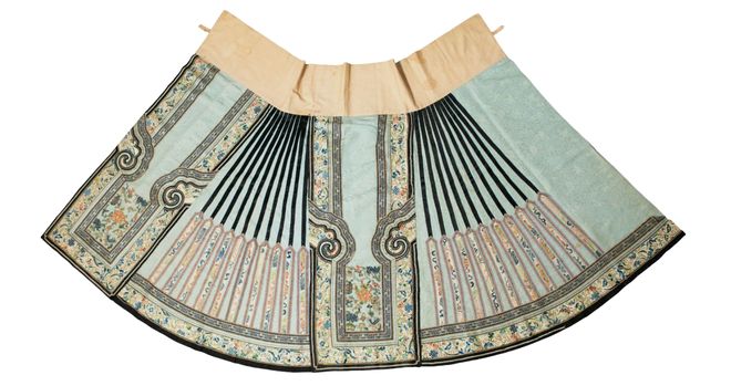 广州博物馆参展文物展出照片及广州博物馆馆藏清代湖水蓝暗花绸贴绣花蝶纹马面裙