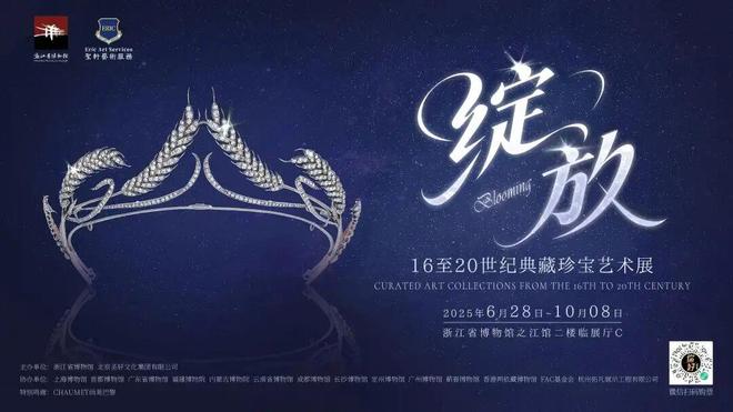 “绽放——16至20世纪典藏珍宝艺术展”海报及广州博物馆馆藏银鎏金累丝烧蓝山水纹嵌玻璃内胆香水瓶展出图片