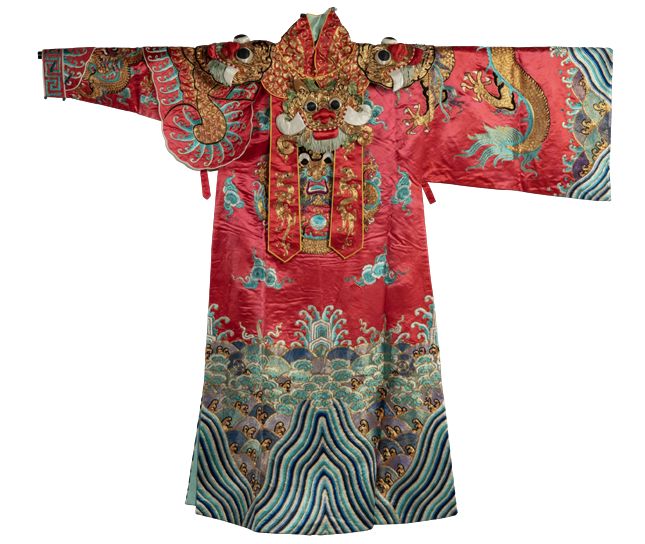 1940年,周信芳为鼓舞民族士气,编写《文天祥》,创制了这身“文武袖”。左袖为宽大的蟒袖,右袖为紧口的靠袖。在红蟒中加入戎装的元素,从而突出文天祥文韬武略的英雄形象。