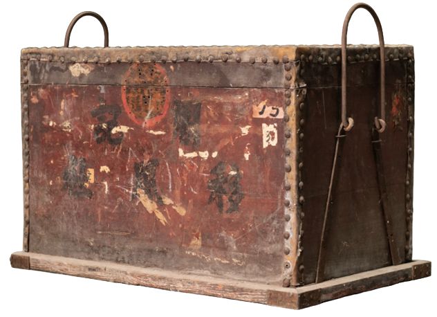 京剧衣箱用来存放运输京剧表演的行头、道具,是一个剧社重要的资产。周信芳1932年组建移风社巡演抗日救国的剧目,这个衣箱跟随其历经风雨。衣箱的右侧后部依稀可见一张运输单,上写“杭甬铁路”字样,是1935年9月周信芳带领剧社赴宁波、南京、杭州等地演出的历史遗迹。