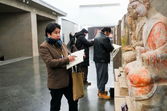 下午,艺术家们至敦煌石窟文物保护研究陈列中心,围绕馆内珍藏的文物展品展开考察与写生。陈列馆内的出土文物、壁画残片、临摹作品等,为艺术家们提供了贴近历史原貌的创作参照。他们或聚焦文物细节,或梳理艺术演变脉络,在写生过程中不断深化对敦煌文化的理解。