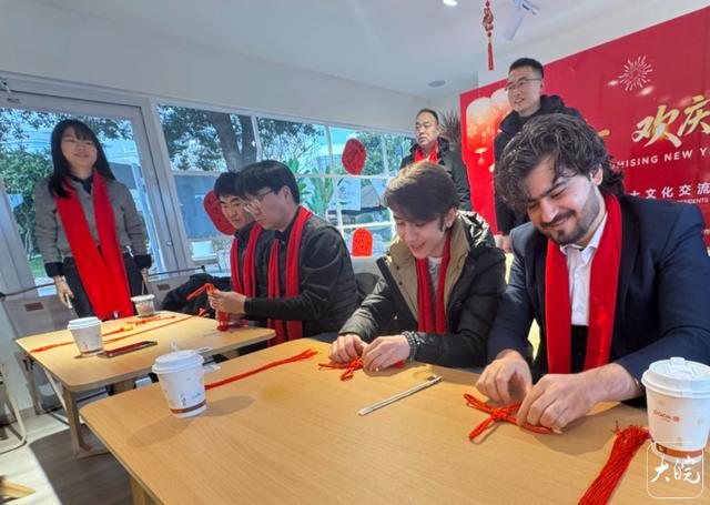 来自塔吉克斯坦的池州学院留学生阿里则格外用心,完成中国结制作后,立刻将这枚红彤彤的中国结挂在自己的衣服上。“挂在身上,就像把新年的好运带在身边!中国结不仅好看,还藏着美好的寓意。”