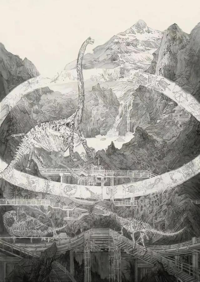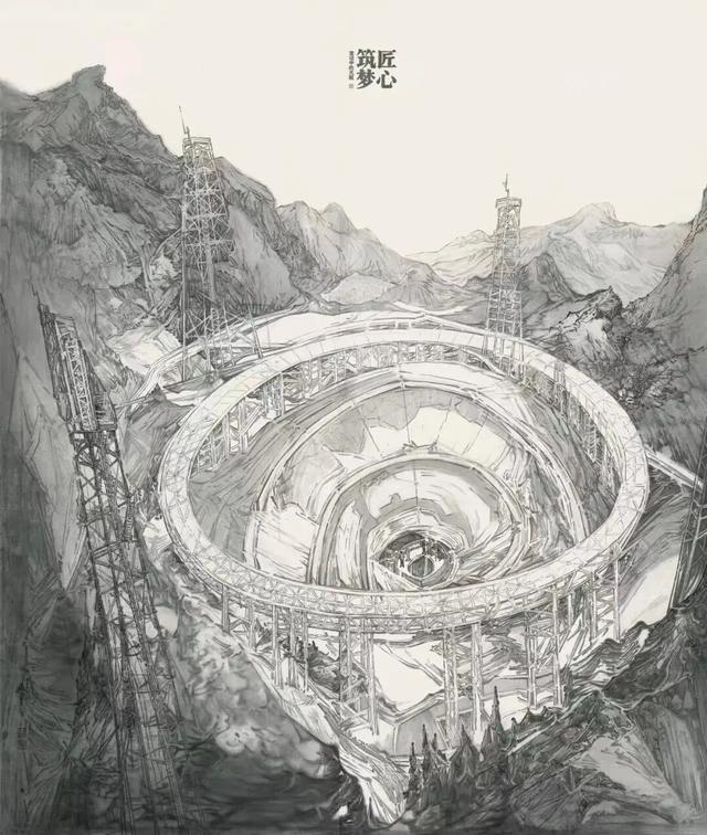 《匠心筑梦——建设中的天眼》是这批探索中的代表作。作品以环抱式构图将画中主体与左右两侧耸立的山峰融合在一起。结合宋代山水画的高远法、深远法营造出群山高低错落的整体布局。山体本身采用了线面结合,皴染结合的手法,层层积墨而成。画面中的用笔,既有细线条的勾写,又有大笔触的书写。造型的趣味,笔墨的味道,画面的节奏韵律,追求在写的过程中自然呈现出来。“写”不仅是在用笔中保持传统书法用笔起止有序的用笔规范,和笔断意连的书写状态,更重要的是在造型上秉持中国写意意象造型的审美追求,不苛求外形肖似却紧抓物像的神采。虚实相生是中国画的法则。画面中深色山体结构严谨、造型扎实,与之形成对比的“天眼”主体框架采用了计白当黑的虚画法。以长短线条淡墨勾写的天眼主体框架,前景钢梁,用爽利的线条勾写其大意,从中心向四周逐渐省略细节,环梁最远处不再着墨,近乎留白。钢轨道由外向内一圈一圈环绕,最终汇集于中心环梁上。通过利用线条走向、黑白色块角度等多种元素,有意使“天眼”框架在视觉上具有漩涡感,不仅增加了“天眼”建设状态的动感,又使画面节奏跳跃富有张力。通过视觉力的牵引成功将观者的视觉最终锁定在“天眼”中心的建设者身上,增加了画面的故事性与生动性,也起到画龙点睛的作用。作品兼工带写并辅助借鉴了版画等其他画种的技术语言,有些地方是在喷壶喷染墨色后趁湿淋写滴洒而成,有些地方借用滚筒,棉布等工具粘墨拓染,这些都是为了在确保构图造型严谨的基础上,进一步强化写意语言随机性与偶发性这一特殊魅力,同时在最终调整阶段进一步加大画面的节奏与韵律对比,使得画面层次更加丰富细腻。创作对象与素材是全新的,以往熟悉的传统语言很难直接拿来。比如,由于处于建设过程中,四周的山体大部分是被机器挖掘过的,完全不可能挪用传统文人山水画中茂密植被覆盖下的山体皴法。但中国画意象造型、意境营造的审美内涵可以被延续,可以结合新的笔墨语言获得新拓展。