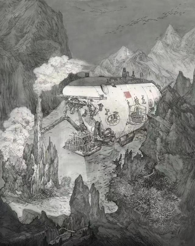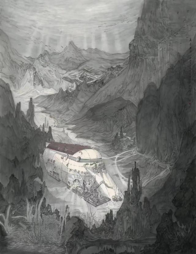 “峰峦深厚,势伏雄强”的宋代山水画拥有“巨碑式”典范构图,为创作提供了参考。画中一侧山体延展出画面形成了山体高度无限延长的视觉感受,以此表现马里亚纳海沟的无限深度。另一侧的海底礁石层叠凸起,从画面上暗示出海沟不断变化的宽度。并借用它奇特嶙峋的结构和附着其上的洋底微生物暗示水下山峰的特殊属性。画面最下方,视觉前景处描绘了细节丰富的海底烟囱。这是深海科考的目的所在,也是画面的次画眼。既要有法度严谨的细细刻画又要表现出矿物质烟囱造型的嶙峋陆离。创作中的画眼无疑是用工作手臂抓取白烟囱,获取硫化物样本的蛟龙号,和万米海底抓取投放物的奋斗者号。潜水器的自带照明系统在海洋深处只能照射7米远。除此之外深海没有任何光源。描绘深潜器的海底作业不仅要营造严肃庄重的感觉,还要兼顾神秘感与玄幻感。选用纯水墨表现深海最符合物理常识。同时水墨语言强大包容的表现力,与玄幻神秘的深海世界也更加契合,更利于深邃、庄重的氛围营造。