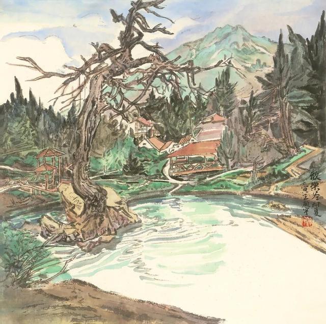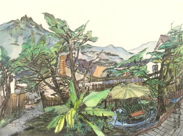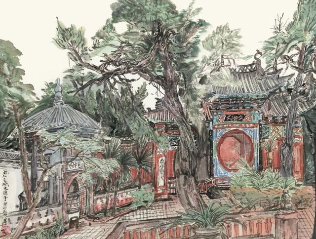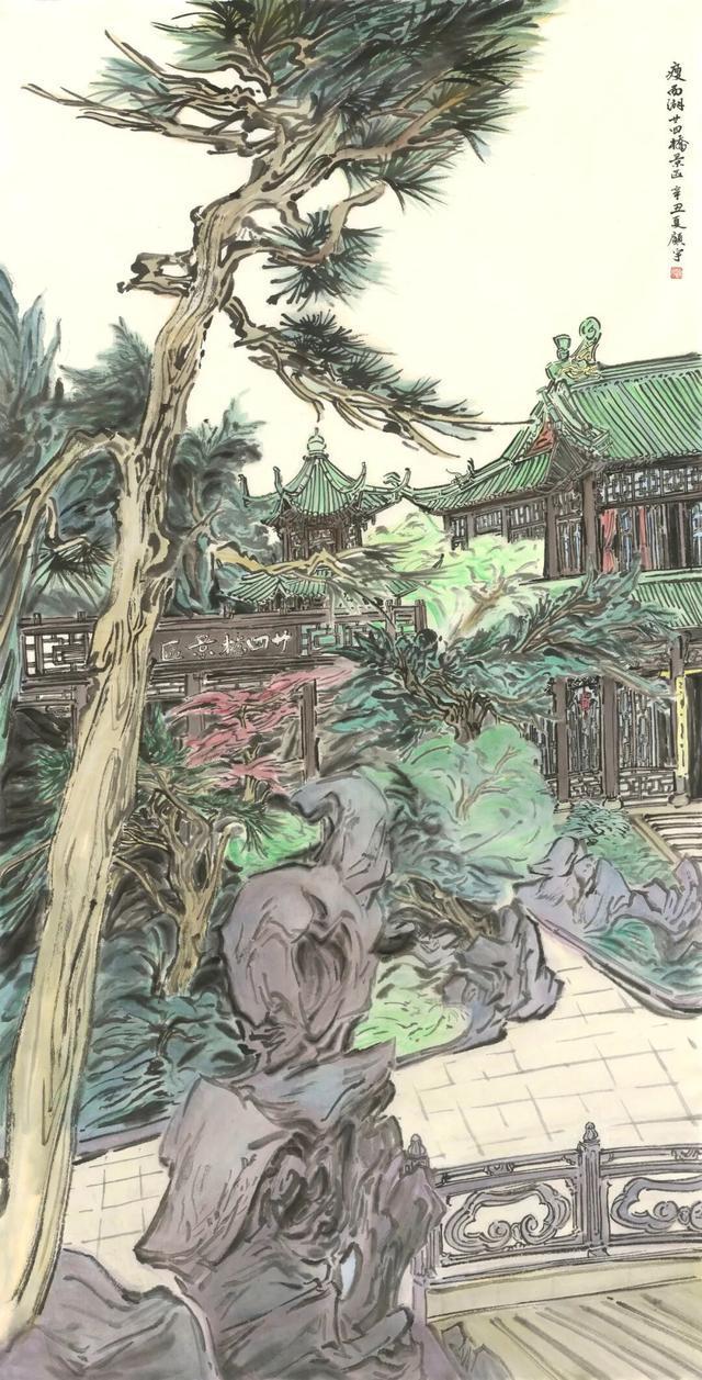 今年春末夏初,我参加了李慧处长带队的水韵江苏写生团,有幸再访瘦西湖,一行成员直奔廿四桥景区,大家于熙春台脚下近千平方米的平台上散开来,各自取景作画。毕老师坐在松树下,画了对岸的小李将军画本与望春楼,我就画了老师身边的太湖石、长松和他身后的熙春台。正值晌午,烈日当头,不宜久留,遂画钢笔速写一幅。时间紧任务重,反而画得轻松洒脱。40分钟左右熙春台与其旁的长廊、凉亭、假山石、逐一呈现来,细看还挺满意。回宁后,依照片与速写为粉本,重画了《瘦西湖廿四桥景区》,呈现出赤栏碧瓦古意浓,春草嫩叶翠色新的气象。此画作为插图收录于《文学家心中的水韵江苏》(江苏凤凰文艺出版社)一书。能用画笔记录下熙春台的春色满园,也算是不枉此行了。