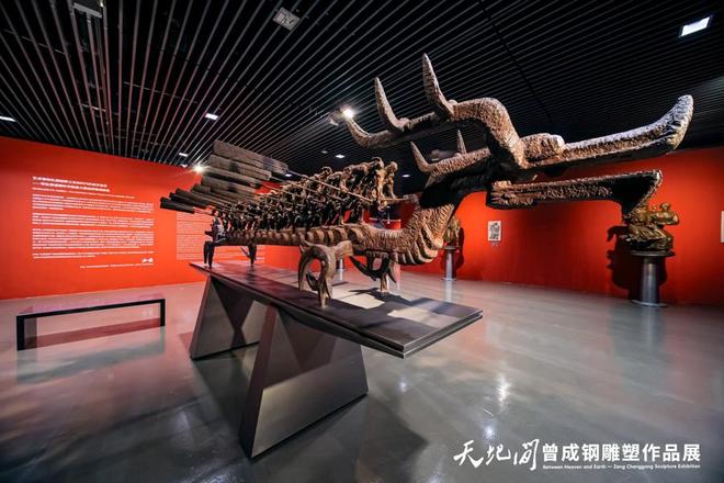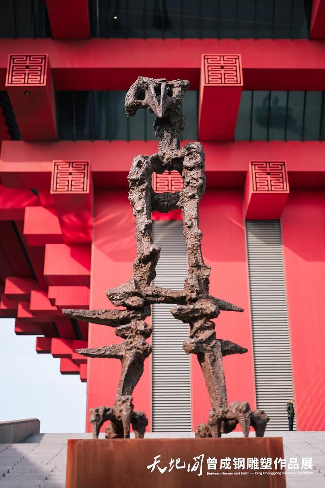 高逾九米的《剧神之柱》昂然指向天空,神采飞扬的《龙马》为观者注入新一年的精神动能,有着凝练造型的《精神不倒》释放着视觉张力……此次展览有相当数量展品被置于上海美术馆两处公共广场,与中国红“东方之冠”建筑彼此呼应,构成序章“山河巨丽”,引导观众步入“天地之间”。