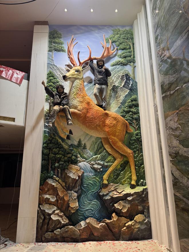 积累了四五年的经验,2025年下半年,他们开始尝试做短视频账号,郭梦涛和刘益民给自己取名“狼尾兄弟”,郭梦涛女朋友出镜不多。一开始流量一般,后来他们在浙江做了一头鹿的浮雕,播放量突破了300万。郭梦涛觉得,这条路走对了。
